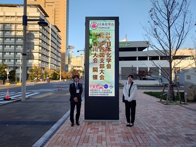 11月23〜24日に徳島文理大学高松駅キャンパスにて2025年日本化学会中国四国支部大会 香川大会が開催され、当研究室ではM1の谷端さんと森本さんが口頭発表を行いました。研究成果の発表や活発な議論を通じて知見を広げるとともに良い刺激を受けることが出来ました。また、学会の合間には、香川名物のうどんや骨付鳥を楽しみ、良い気分転換となりました。今回得られた知見や経験を、今後の研究活動に活かしていきたいと思います。